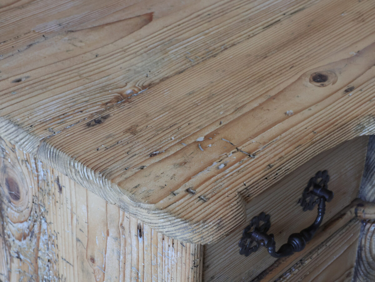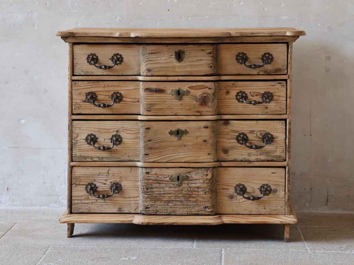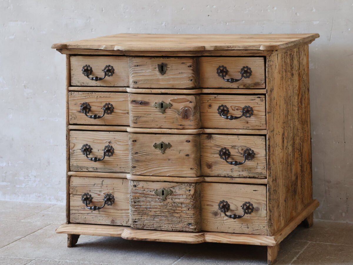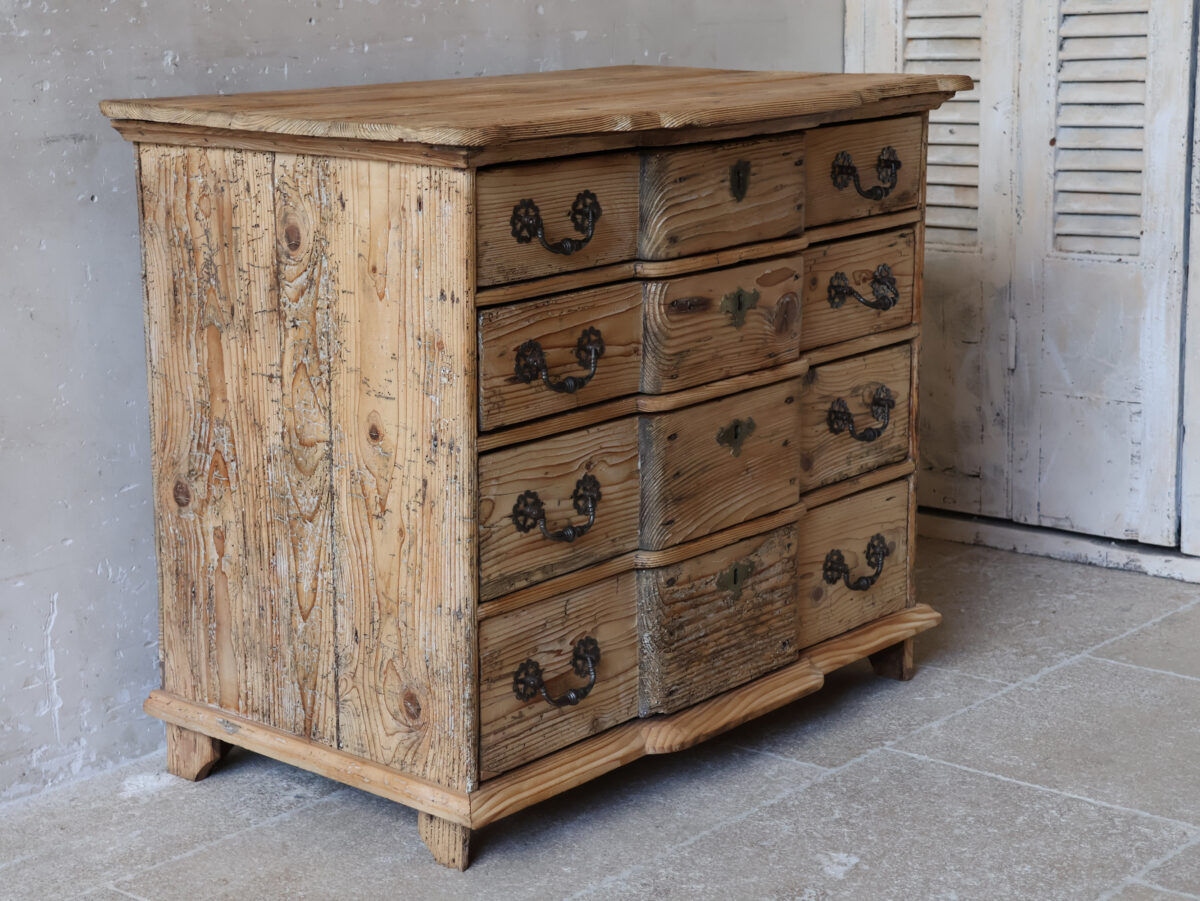 Een prachtig 18e-eeuws grenen meubel met een schitterend doorleefd karakter. Dit antieke ladenkastje is een prachtig voorbeeld van vakmanschap uit die tijd. De lichte kleur van het hout, gecombineerd met de patina en de originele antieke beslagen, geeft het stuk een warme, authentieke en tijdloze uitstraling.