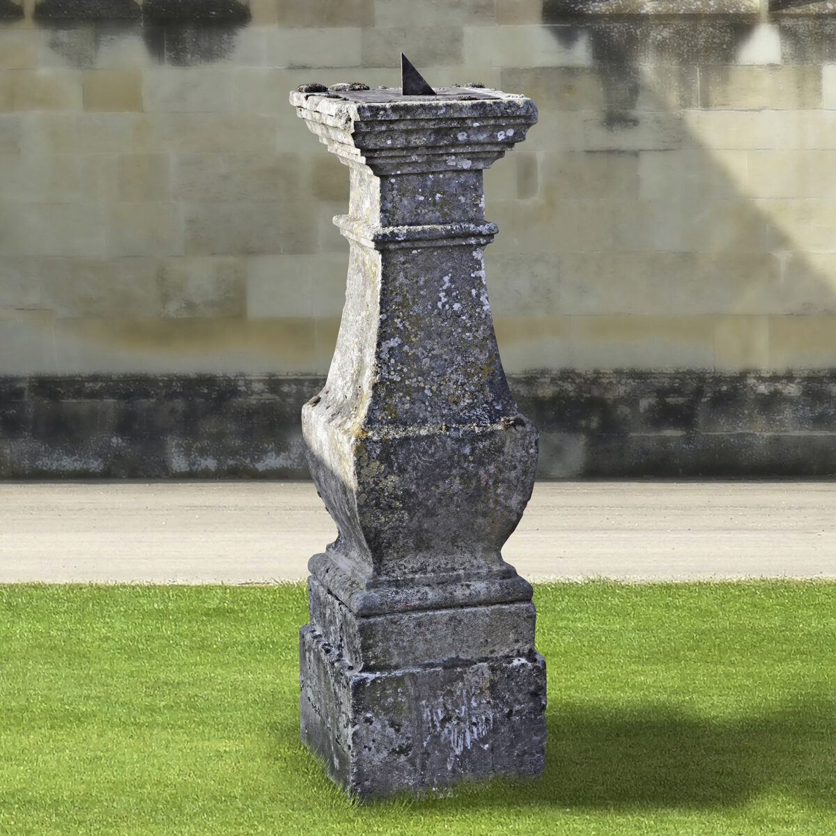 18e eeuwse Franse gesneden kalkstenen balusterzuil, met zonnewijzer. Deze balusterzuil heeft een rechthoekige vorm en is oorspronkelijk uit de 18e eeuw. Het is nu omgebouwd tot een zonnewijzer, met een ijzeren wijzerplaat in een afgeronde vierkante vorm en een eenvoudige gnomon (de verticale wijzer van de zonnewijzer).