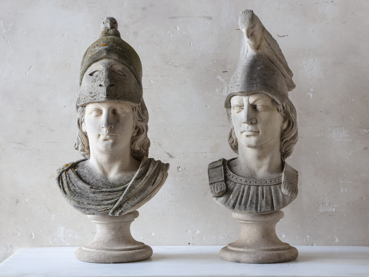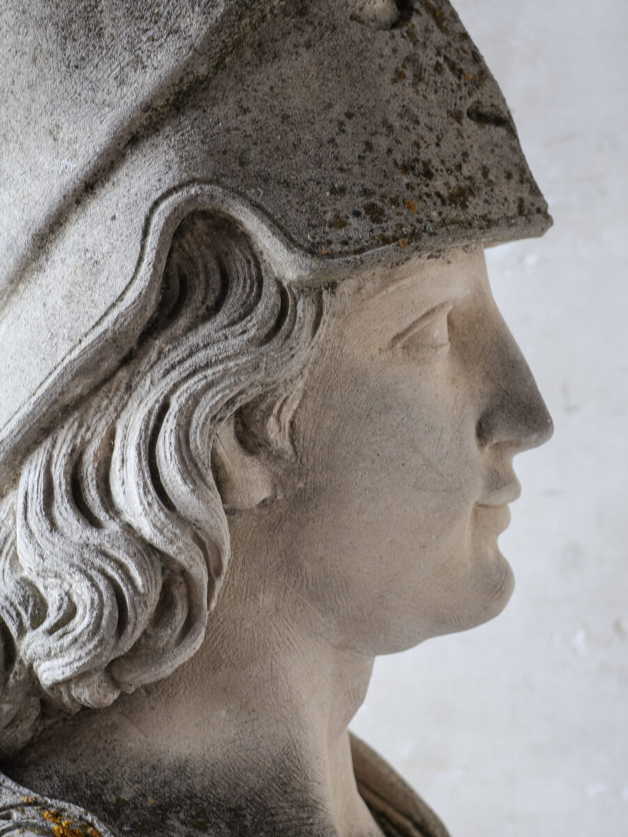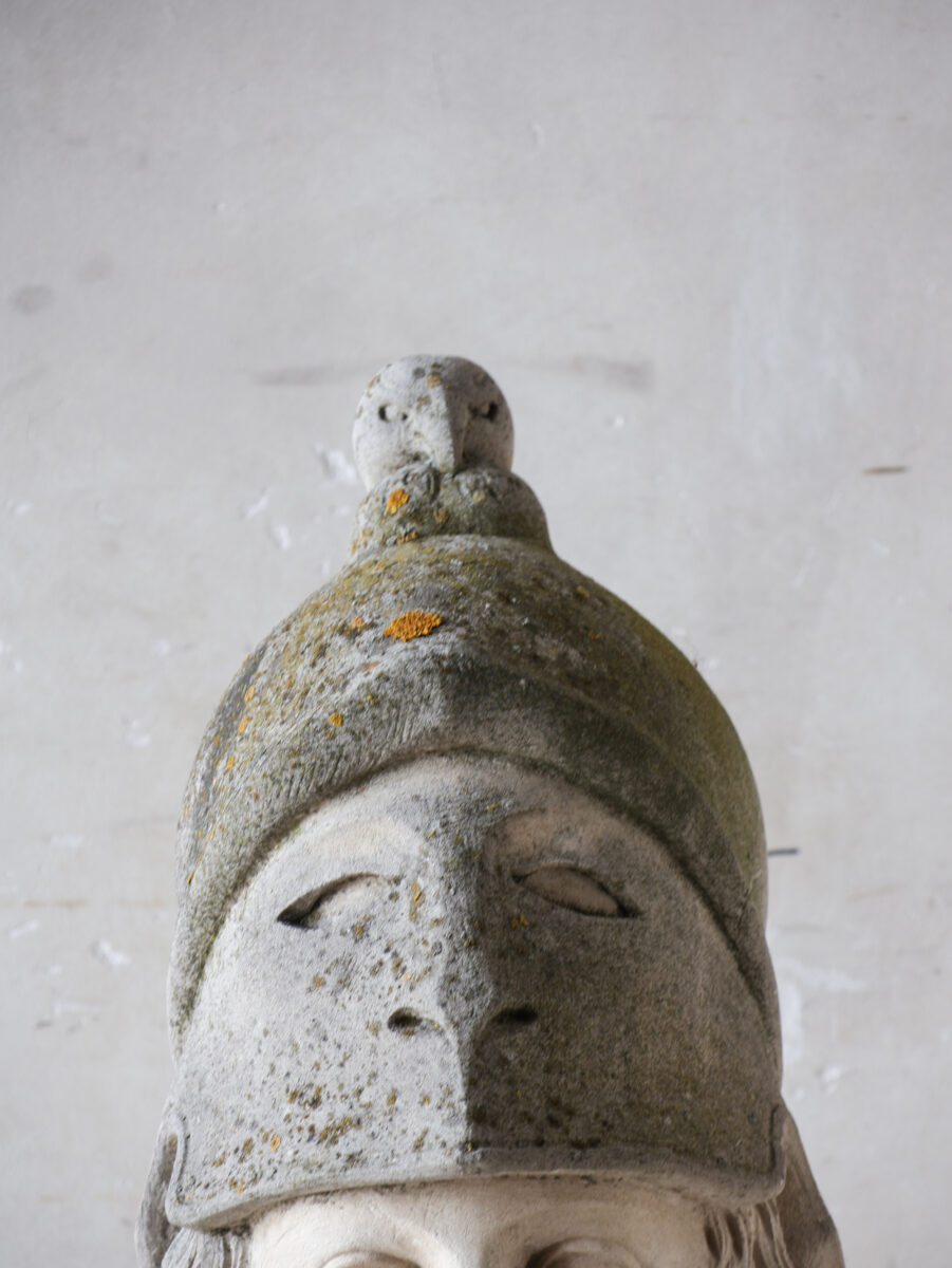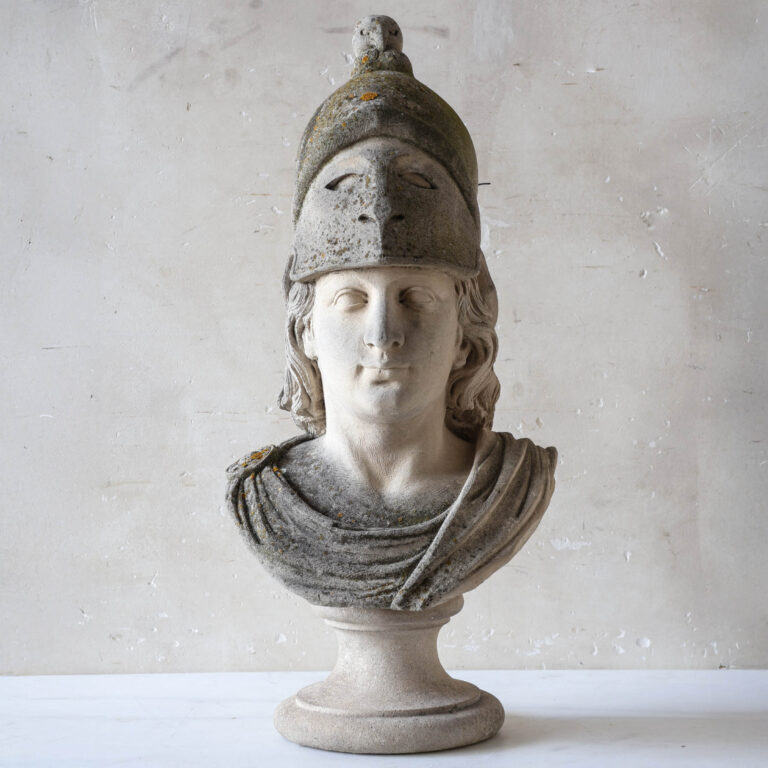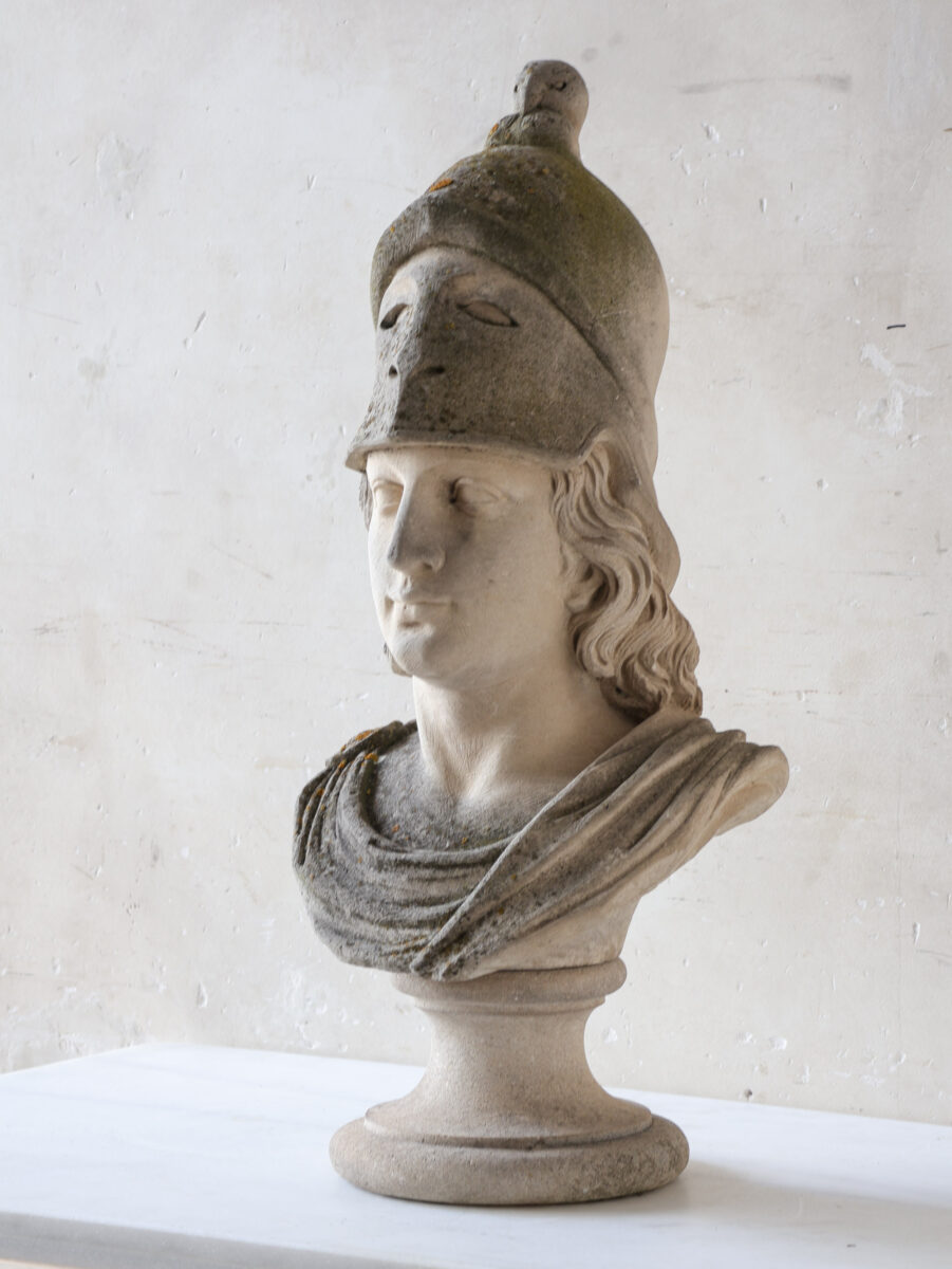 Een bijzonder element is de fantasierijke helm, bekroond met een adelaar. Deze vogel symboliseert kracht en moed en benadrukt de majesteit van de krijger. De buste en sokkel tonen een natuurlijke patina met lichte sporen van mos, wat de leeftijd en historische uitstraling versterkt. Zichtbare snijsporen onderstrepen het ambachtelijke karakter van dit kunstwerk.