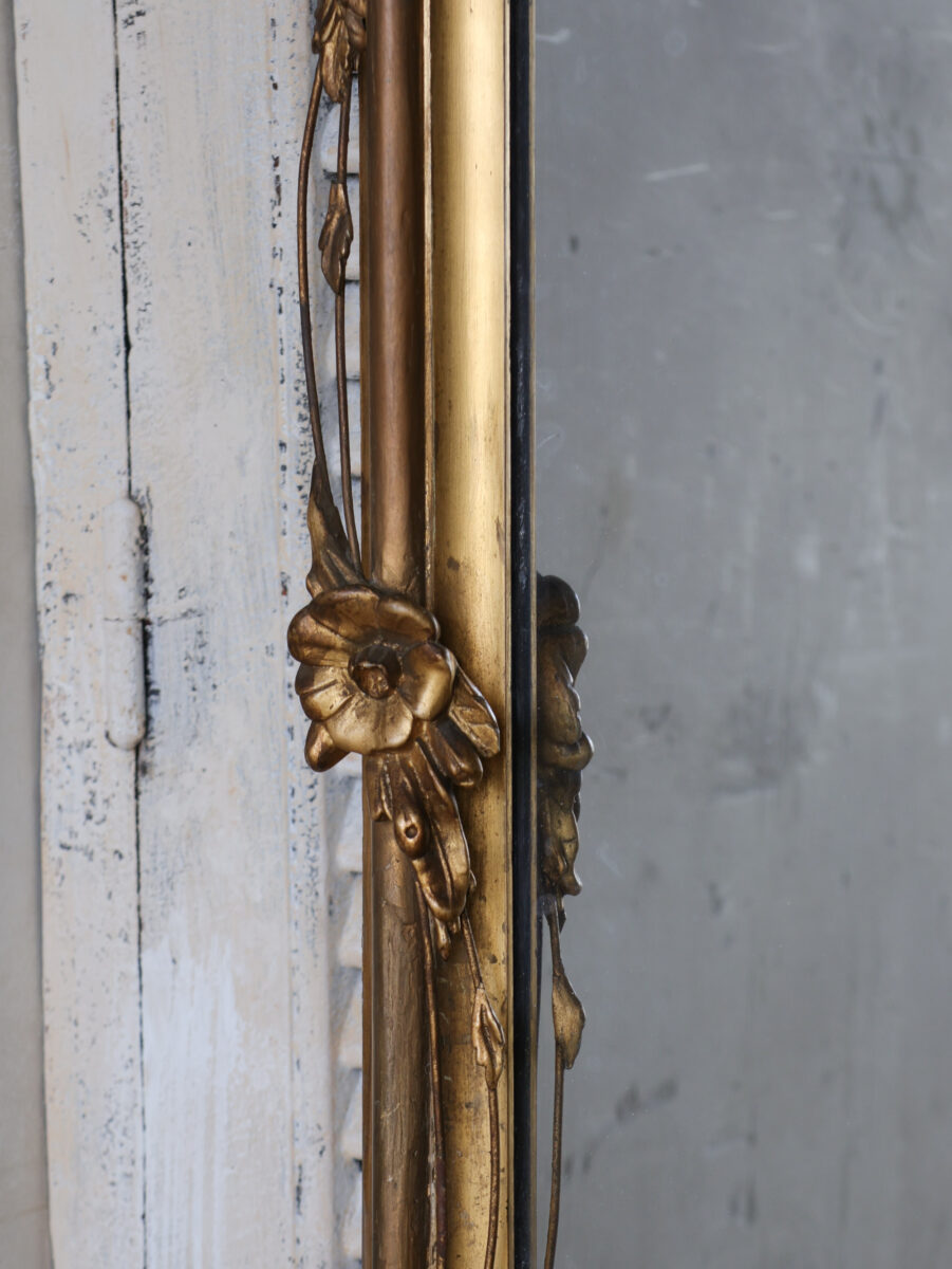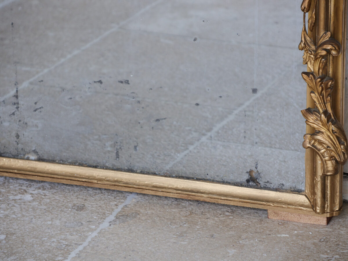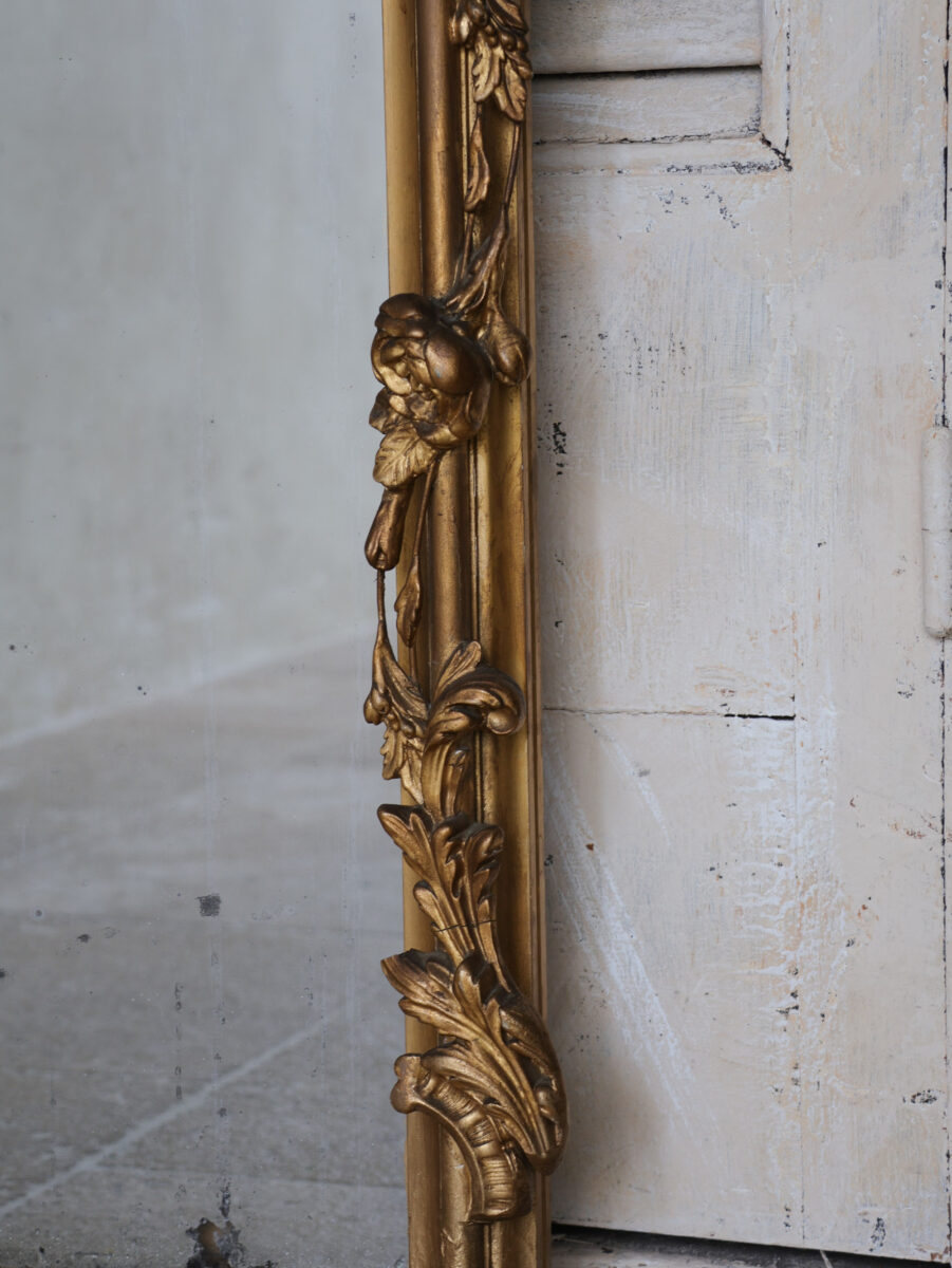 Imposante antieke kuifspiegel uit de 19e eeuw in Rococo stijl, afgewerkt met een warm goud patina. De rijk bewerkte lijst is gedecoreerd met florale ornamenten en bekroond met een uitbundige kuif met bloemenguirlandes – typisch voor de Franse Rococo. Het licht verweerde spiegelglas draagt bij aan de authentieke antieke charme. Met een hoogte van 290 cm is dit een prachtige statement-passpiegel of een majestueus middelpunt in een hoge hal, woonkamer of entree.