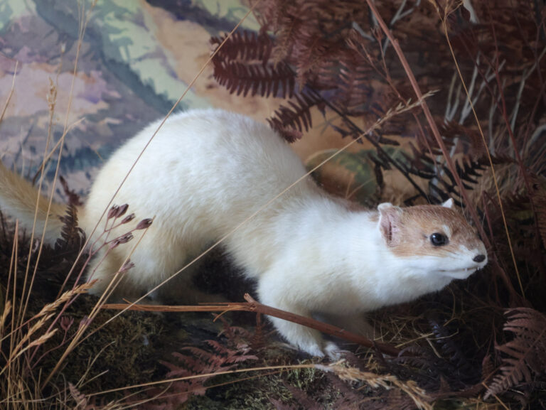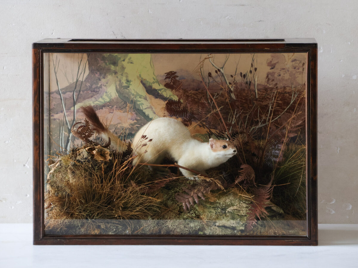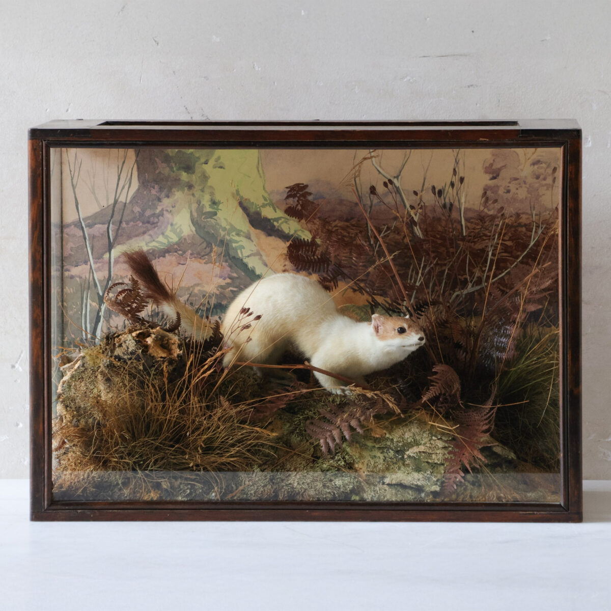 Het diorama is geplaatst in een sfeervolle houten kast met glazen front. De natuurlijke habitat is gerecreƫerd met grassen, varens en elementen die de omgeving van de hermelijn nabootsen, compleet met een gedetailleerd aquarel geschilderde achtergrond die diepte toevoegt.