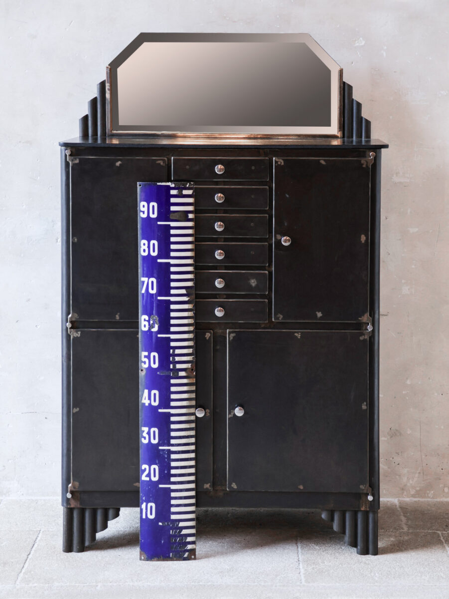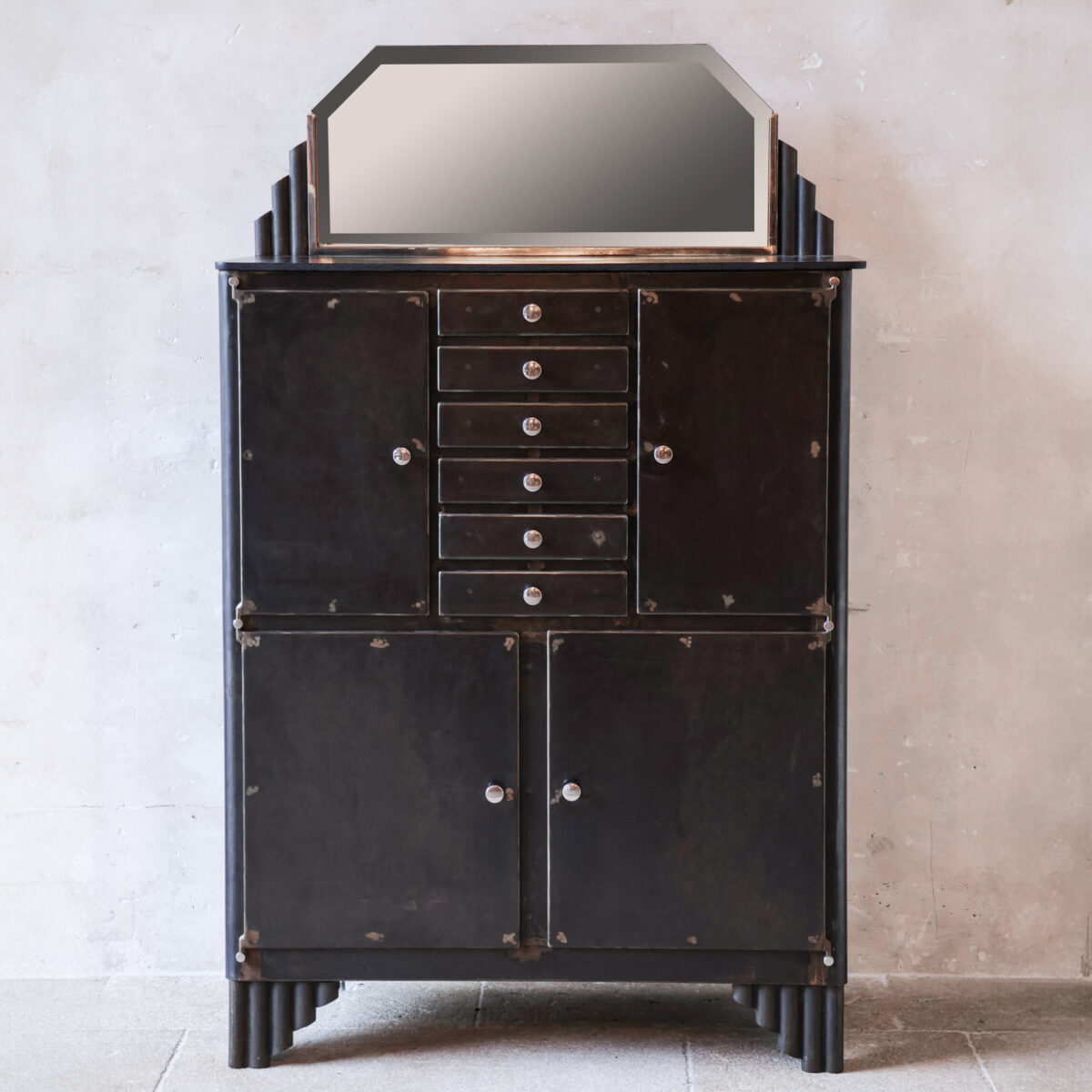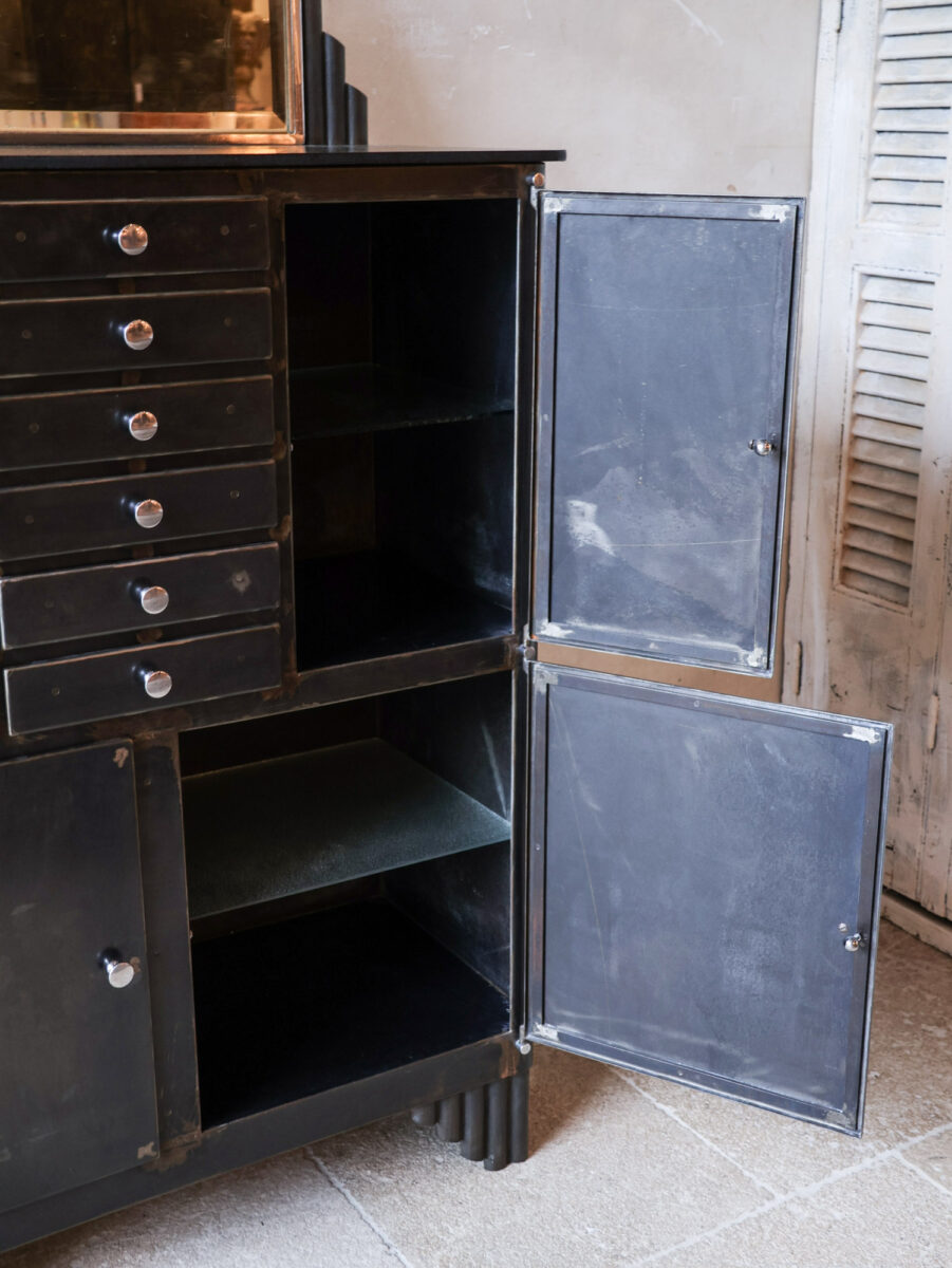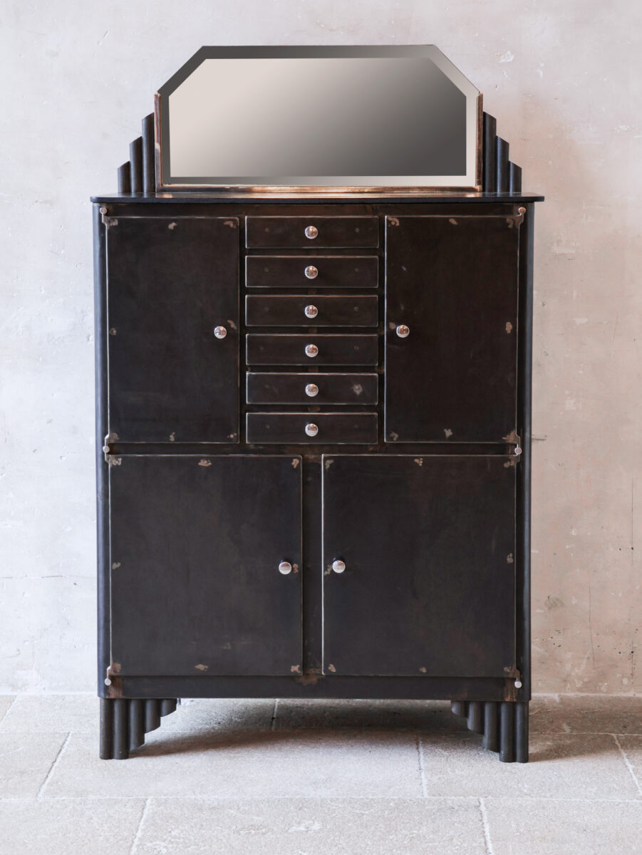 Art Deco metalen tandarts- of medische kast met spiegel (medical cabinet). Zwaar metalen wandmeubel van industriële kwaliteit. Deze ijzeren kast heeft Art Deco-details en een facetgeslepen spiegel. Met zes lades en vier deuren, en glazen plankjes (achter de linker deurtjes zijn geen glazen plankjes aanwezig).
