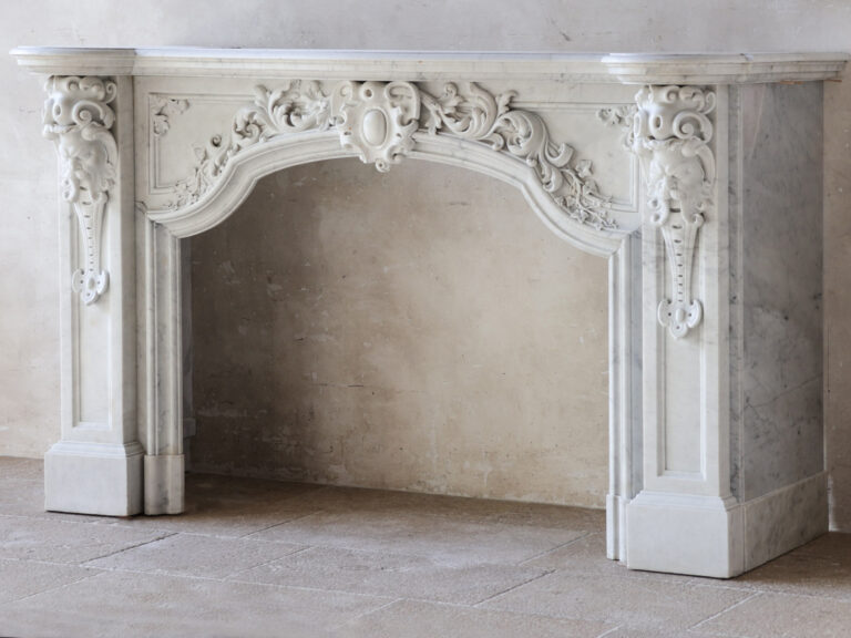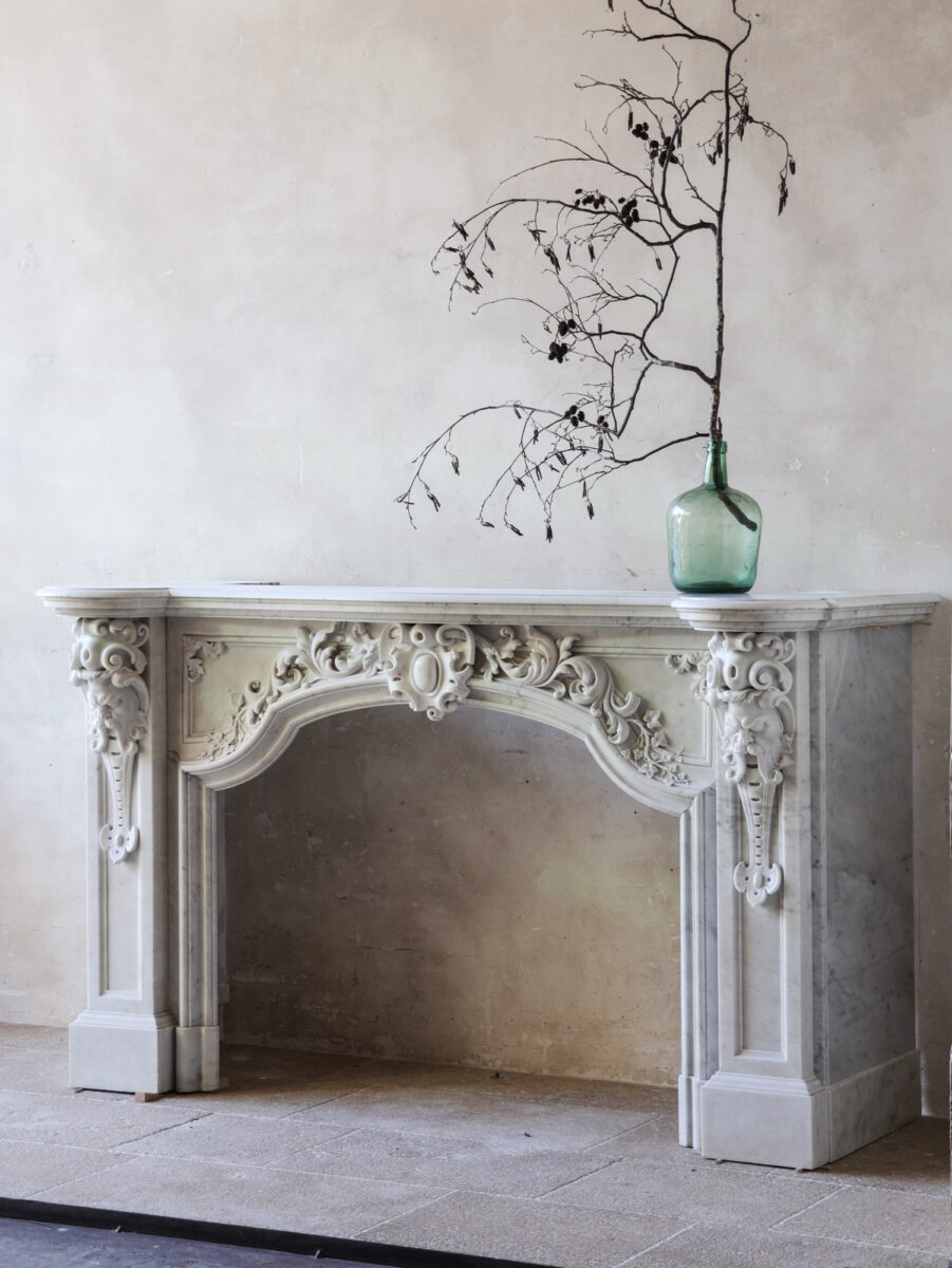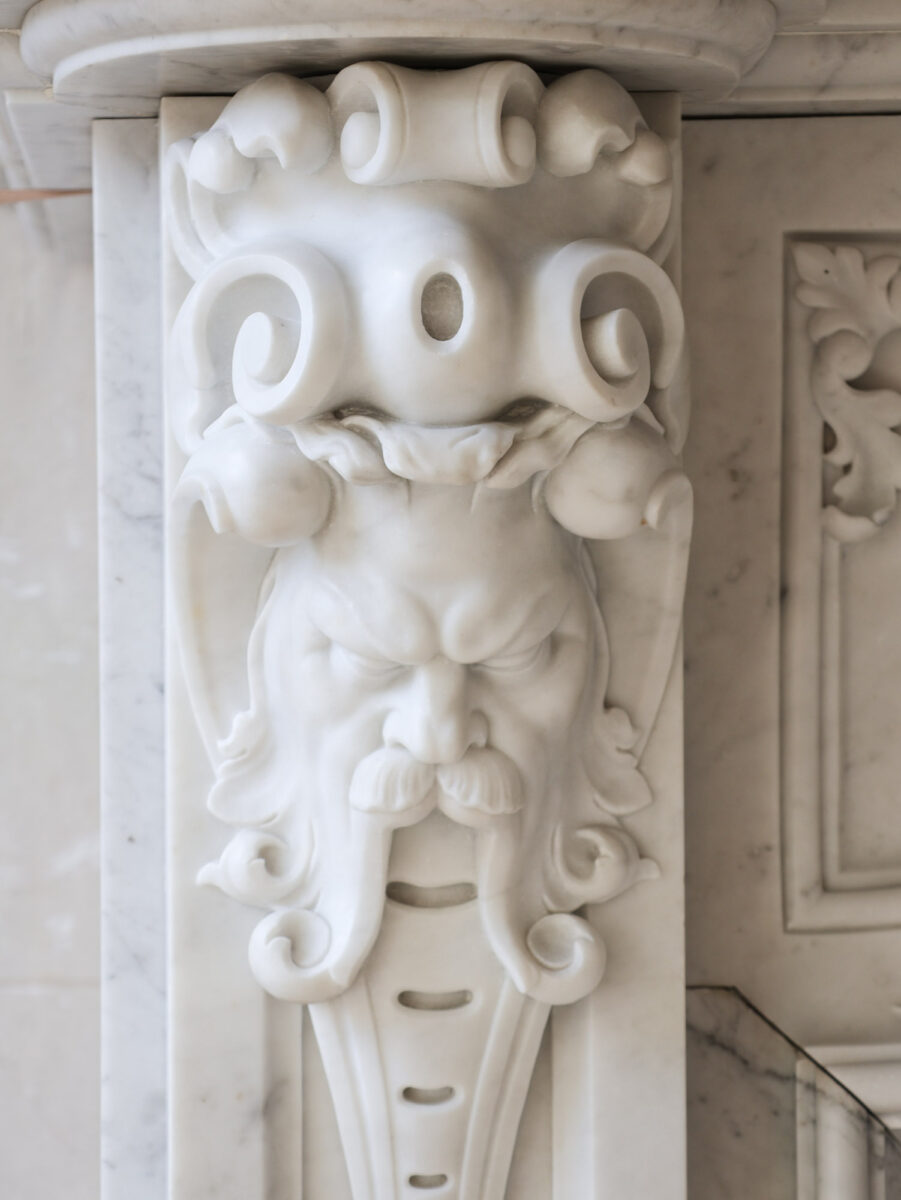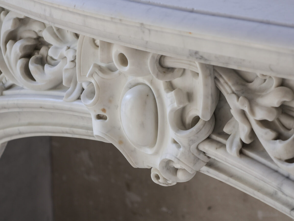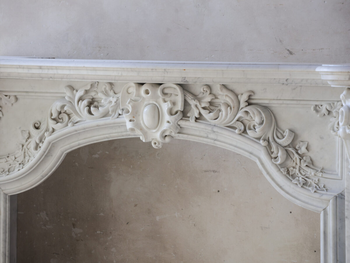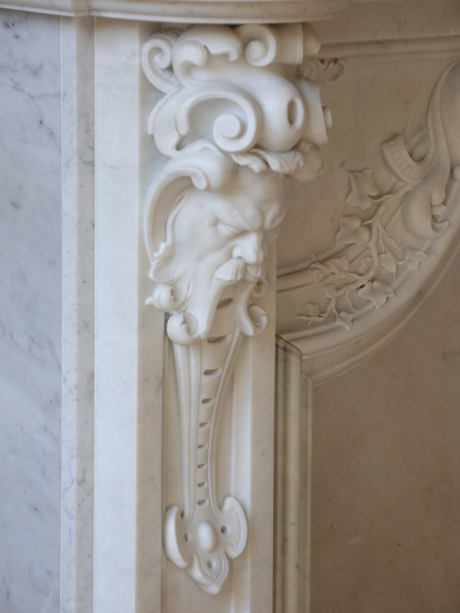 Deze bijzondere, grote schouw is gemaakt van hoogwaardig Statuario Bianco Carrara marmer. Vermoedelijk afkomstig uit Noord-Europa of Noord-Frankrijk, combineert de schouw strakke lijnen met verfijnde details, zoals het ovale cartouche in het midden, versierd met bladmotieven en klimop, wat zorgt voor een unieke mix van elegantie en karakter.
