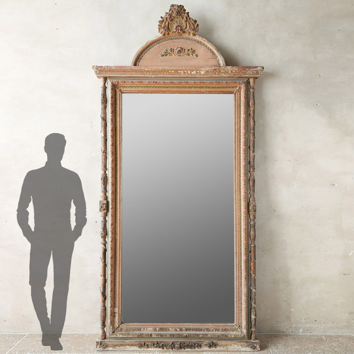 Extra grote antieke spiegel. De hout gestoken lijst gedecoreerd met patronen in gesso. De spiegel heeft een halfronde kuif met bloemdecoratie en daarboven een schelpornament. De lijst is verrijkt met twee zuilen die gedecoreerd zijn met bladmotief om de zuilen heen gewikkeld en rozetten op de middenstukken. De spiegel is  gepatineerd in zachte pastel tinten zoals zacht roze lichtgroen en lichtblauw. De oude patina zichtbaar gesleten, er zijn een paar niet zo zichtbare krassen op het spiegelglas en er zijn oude schades aan de gesso decoraties die passend zijn voor de leeftijd en niet af te doen aan het karakter van deze prachtige grote spiegel.