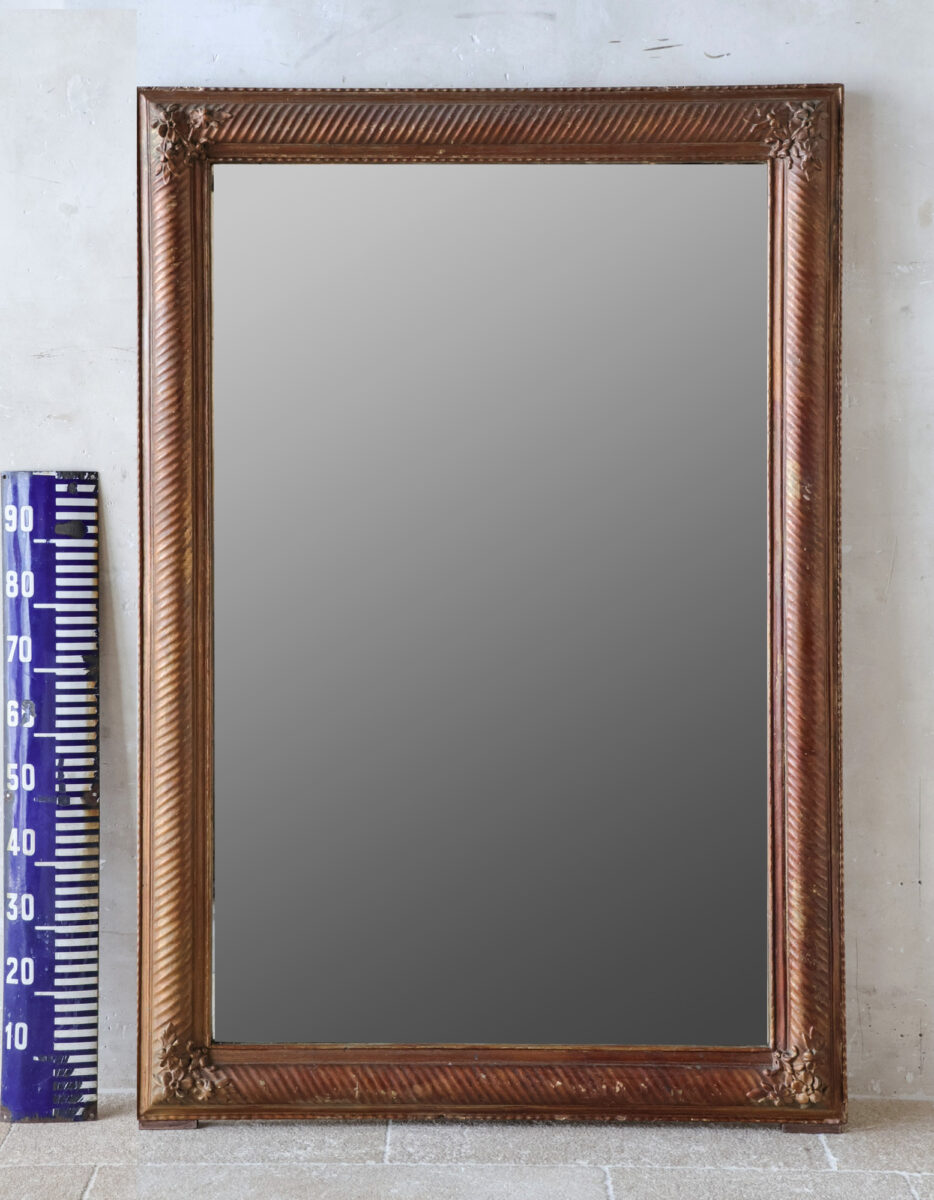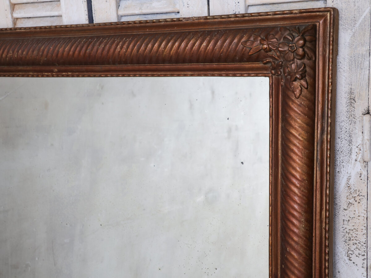 Deze 19e-eeuwse Louis Philippe spiegel heeft een zware lijst met een rijke, donkergouden tot bronskleurige afwerking. De lijst is versierd met een gedetailleerd touwpatroon en wordt in de hoeken onderbroken door fijn gesneden bloemdecoraties. Dit model kan zowel verticaal als horizontaal kan worden opgehangen.