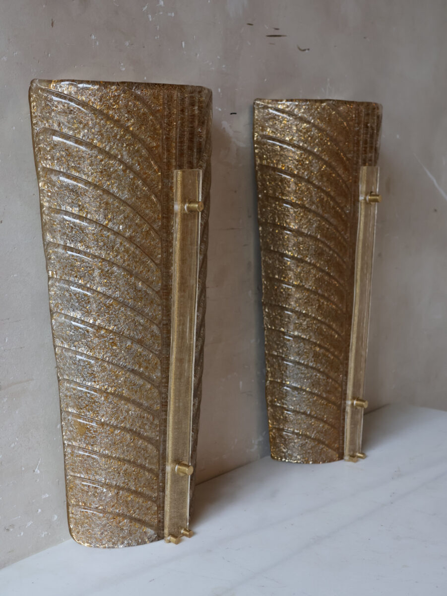 Set van twee imposante Italiaanse wandlampen. Deze armaturen zijn uitgevoerd in zwaar Murano glas, kenmerkend door de warme amberkleur en het ingesloten goud-effect.