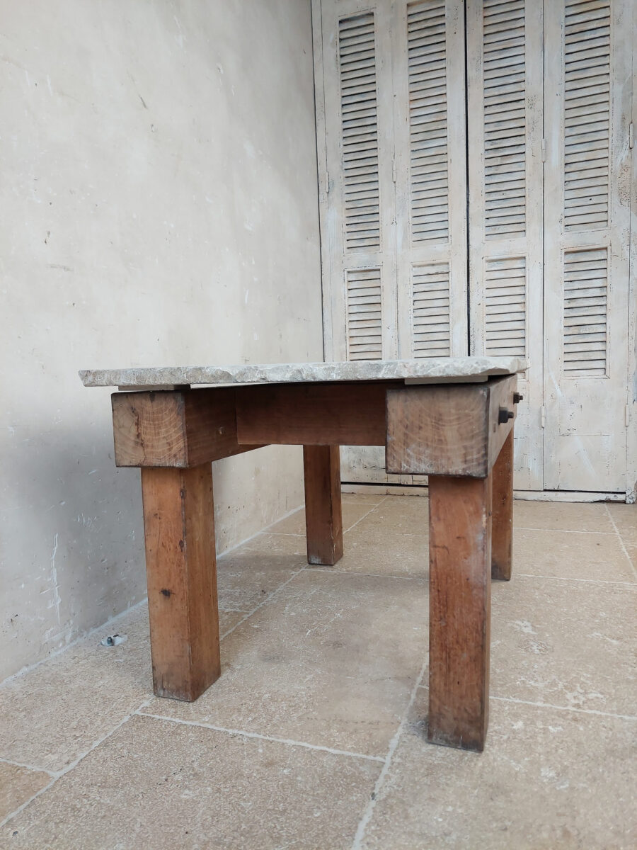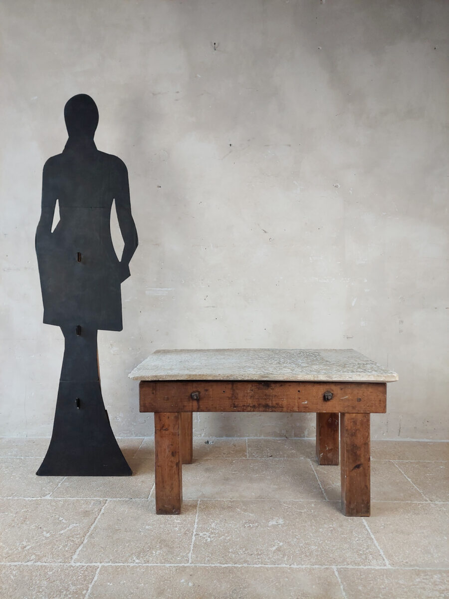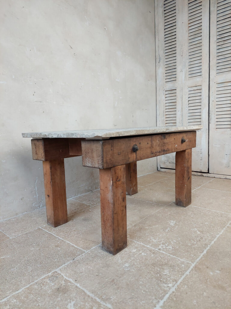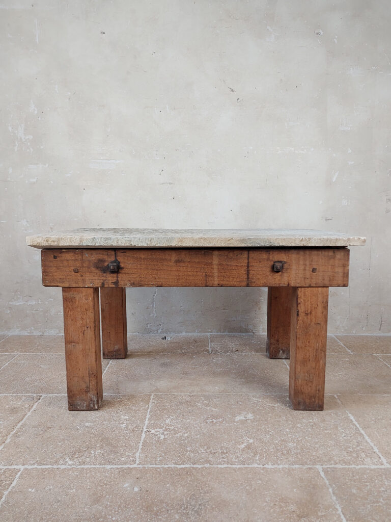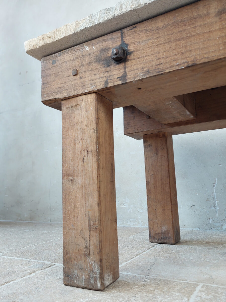 Robuuste houten salontafel met rustieke stenen dal als blad