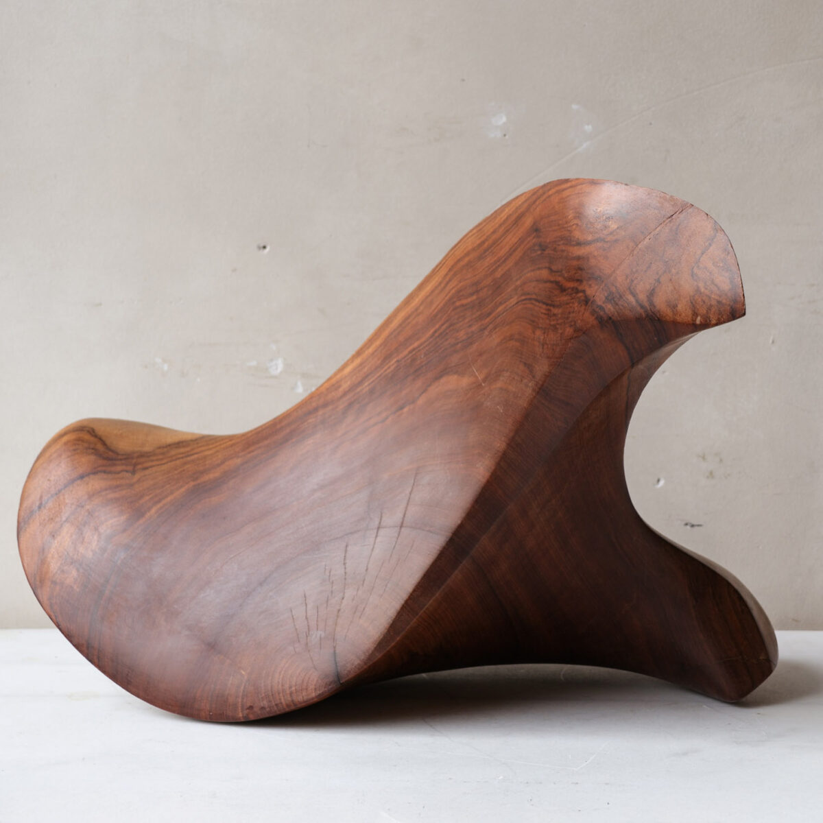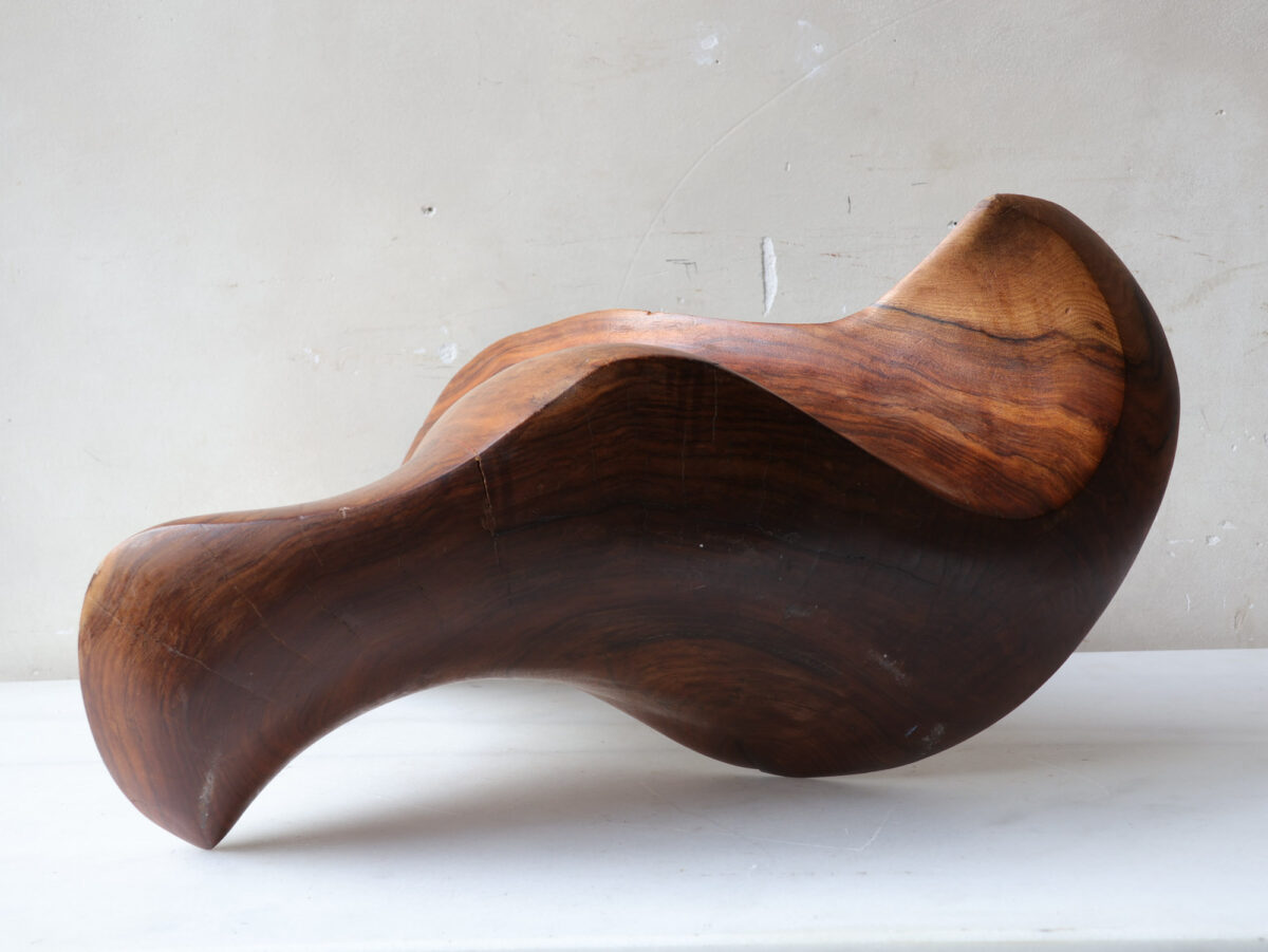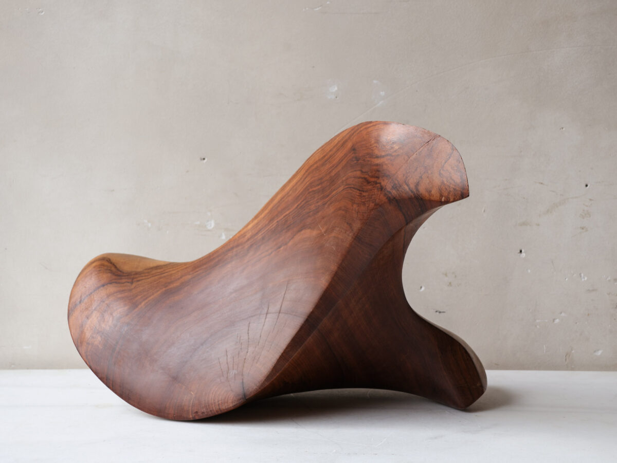 Deze abstracte sculptuur is met de hand vervaardigd uit massief notenhout, kenmerkend voor de organische designtrends van de jaren ’70. Het ontwerp presenteert vloeiende, sensuele vormen die vanuit elke hoek een dynamisch silhouet creëren.