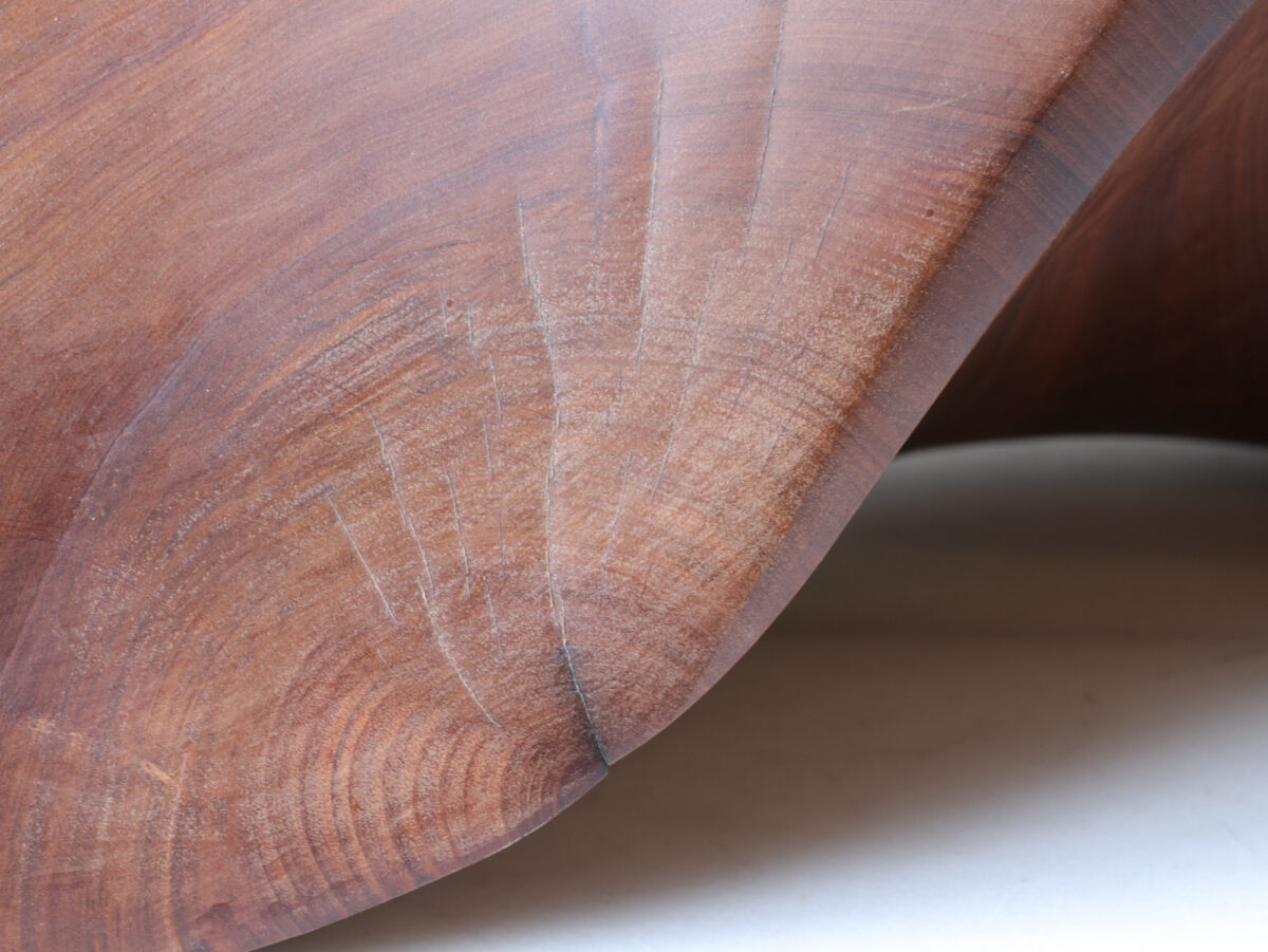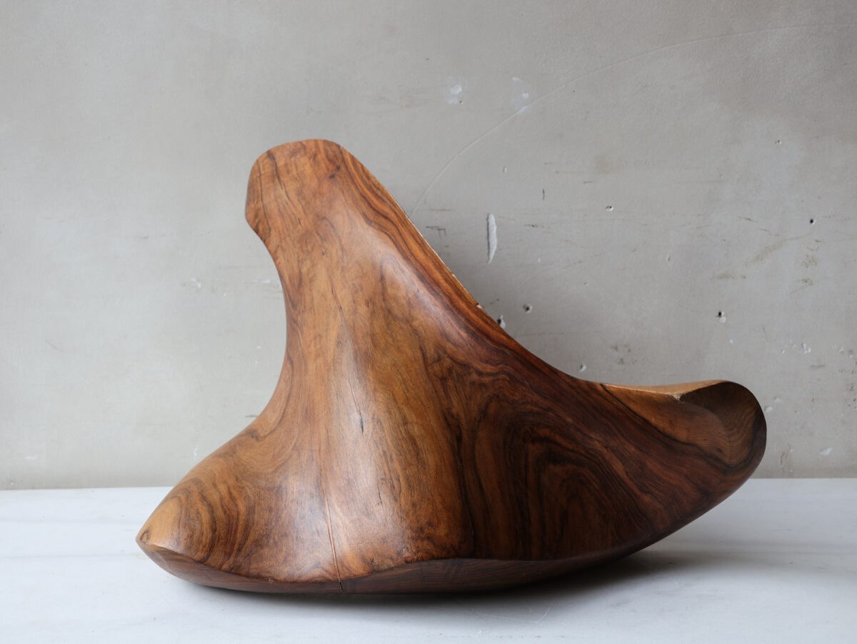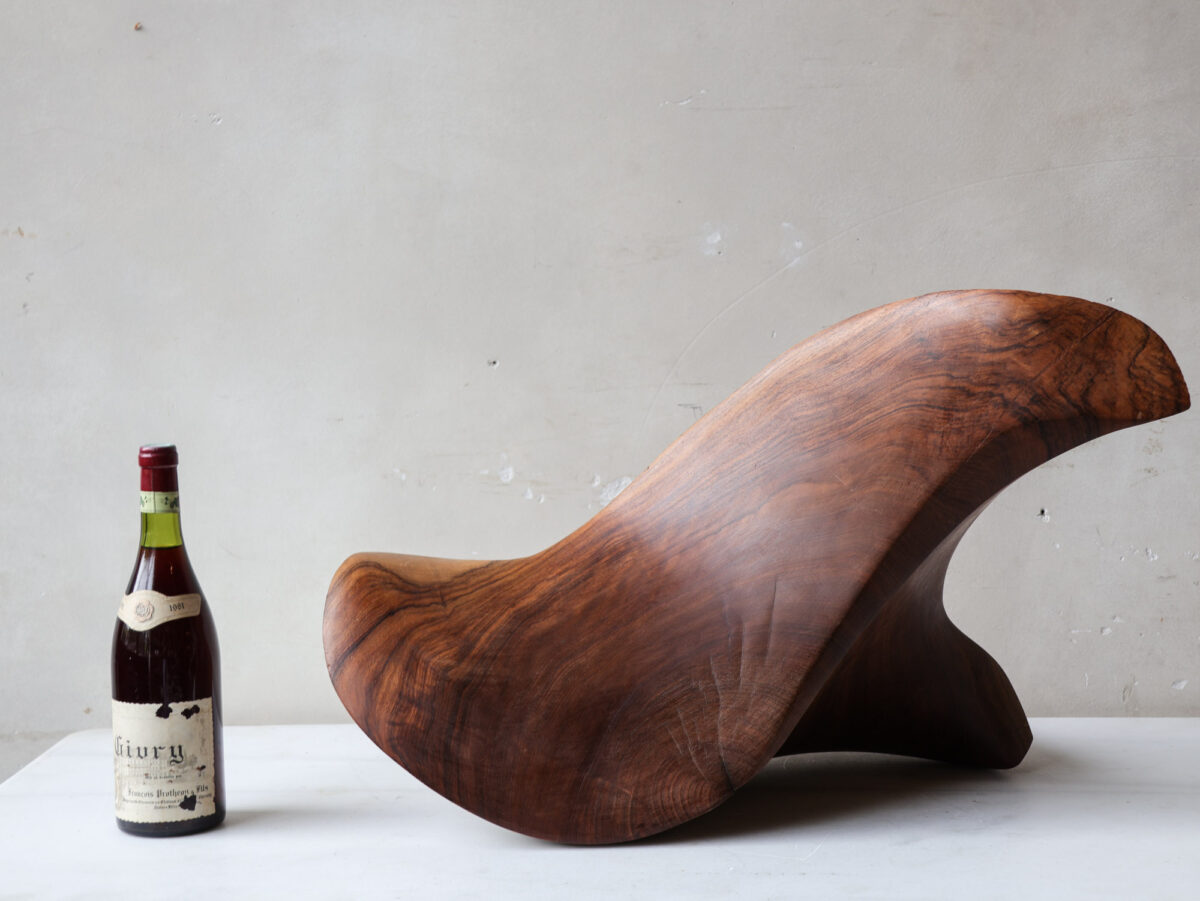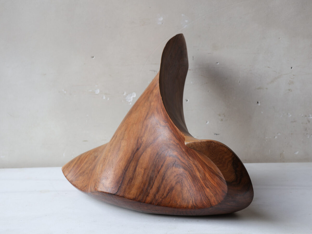 Deze abstracte sculptuur is met de hand vervaardigd uit massief notenhout, kenmerkend voor de organische designtrends van de jaren ’70. Het ontwerp presenteert vloeiende, sensuele vormen die vanuit elke hoek een dynamisch silhouet creëren.