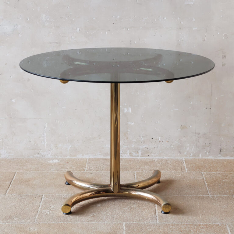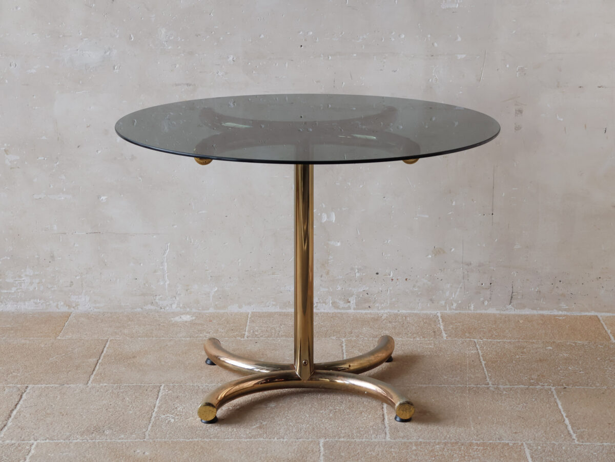Mid-Century ronde tafel met een glanzende, verchroomde messing voet met een klassieke driepoot kruisbasis. Het tafelblad is gemaakt van rookglas (smoke glass) en creëert een stijlvol contrast met het warme messing.