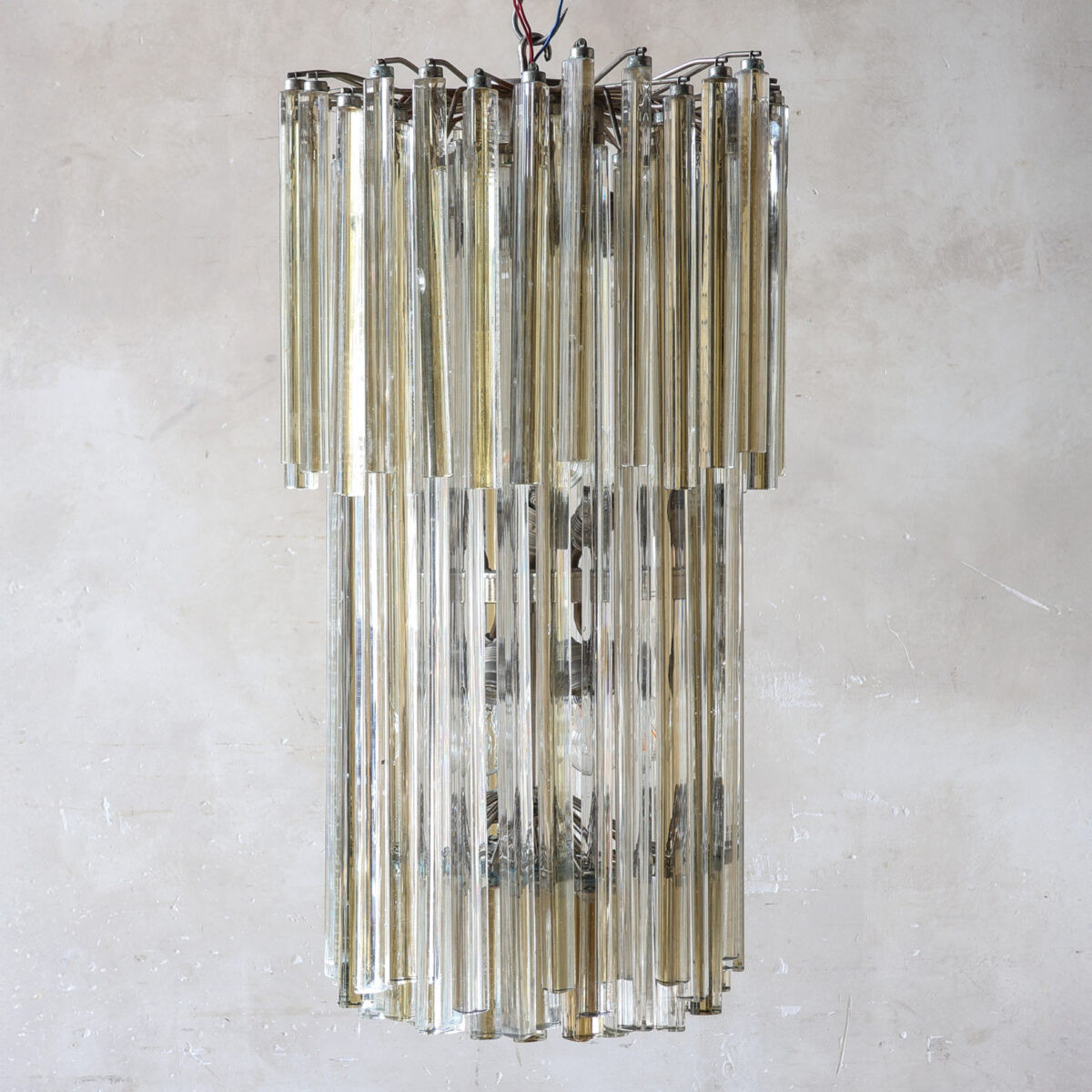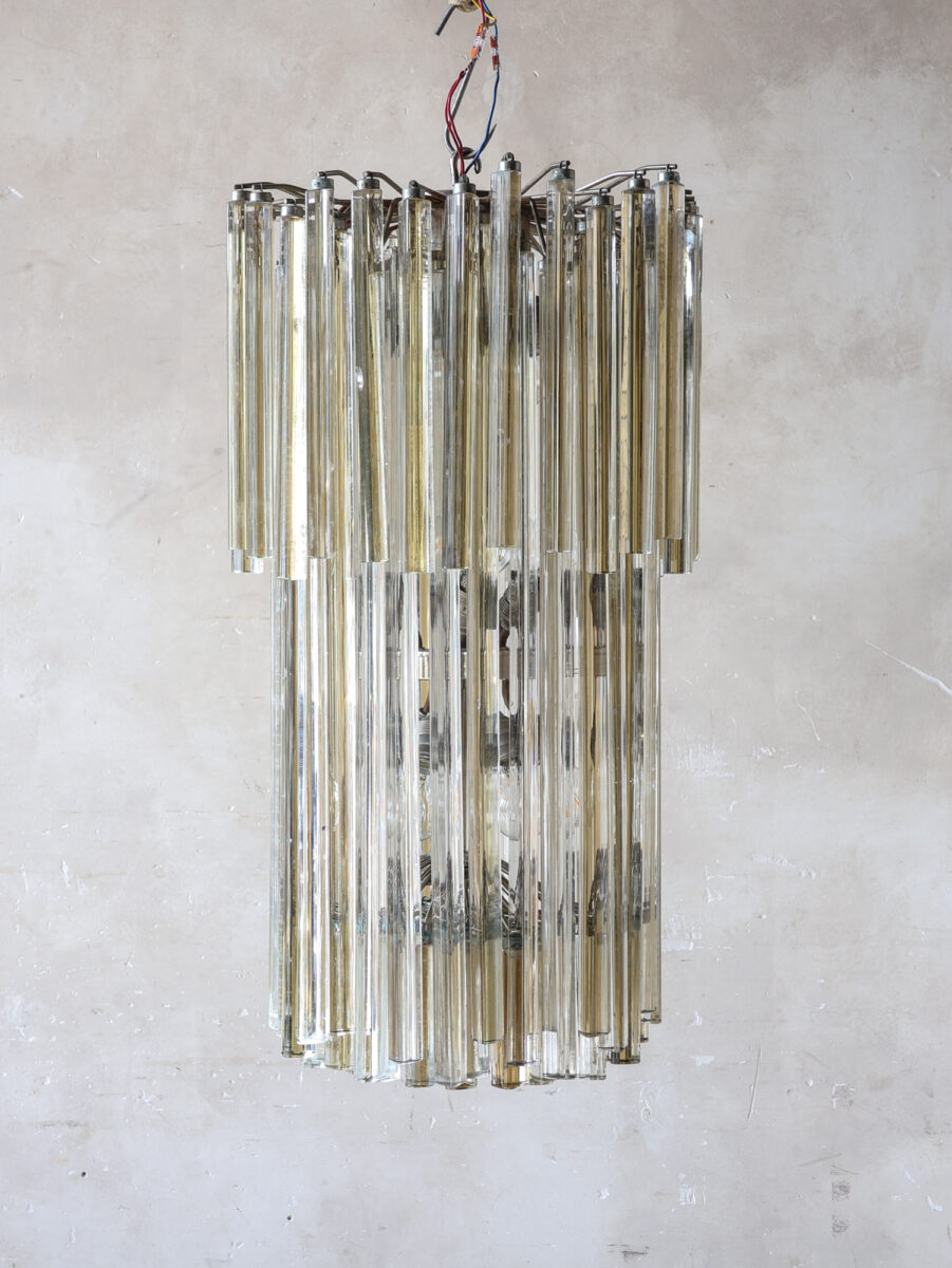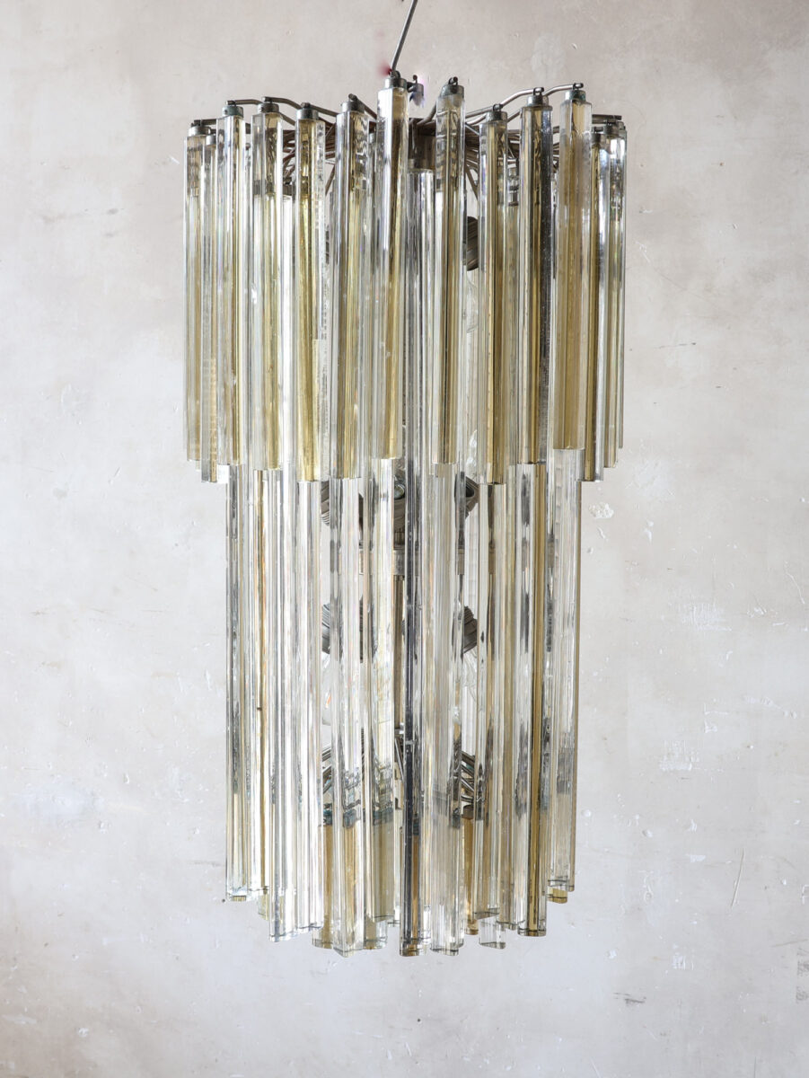 Grote Venetiaanse hanglamp met ‘Triedri’-pegels van Muranoglas, toegeschreven aan Venini, ca. 1970. De kroonluchter is opgebouwd uit lagen amberkleurig en helder glas, waarbij de langwerpige pegels zorgen voor een prachtig spel van licht en reflectie.